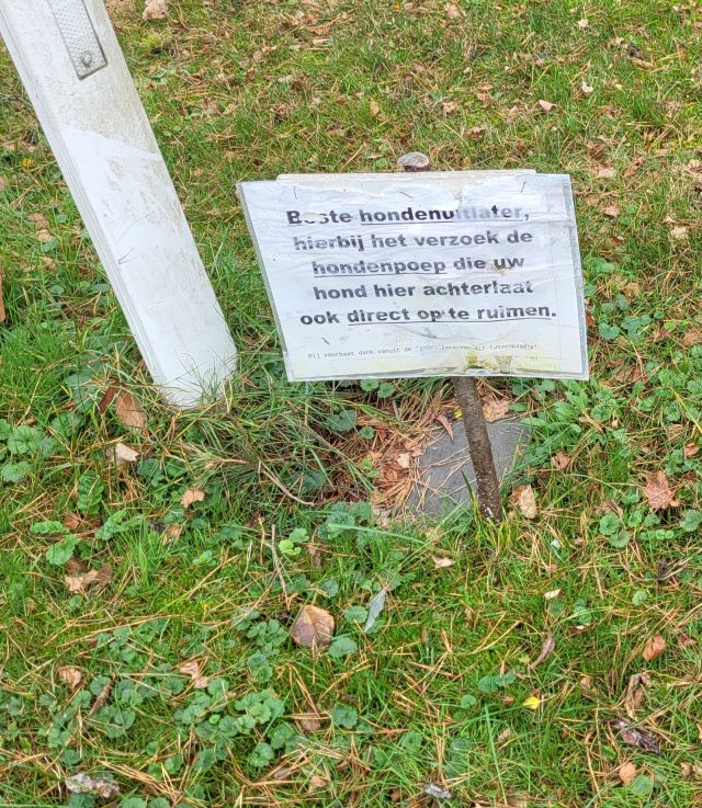 Het is toch te gek dat een van onze parkgasten een bordje bij een hondendrol moet plaatsen met het verzoek aan de hondeneigenaar om dit exemplaar netjes op te ruimen.