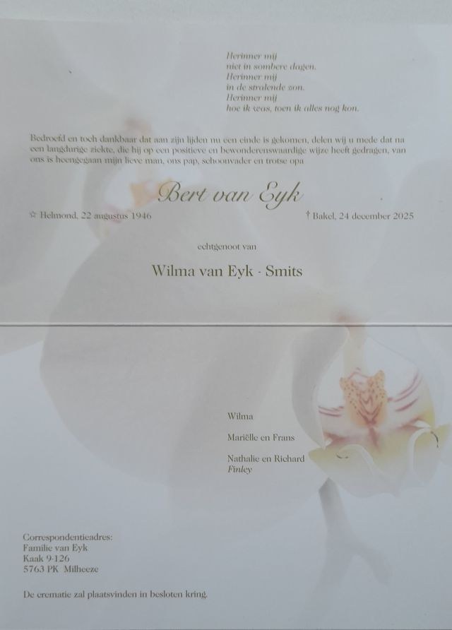 Overlijdensbericht Geplaatst op 29 december 2025 door Geert Verhoeven We hebben het droevige bericht ontvangen dat Bert van Eyk op 24 december j.l., op 79 jarige leeftijd is overleden. Wij wensen de familie heel veel sterkte met dit grote verlies.